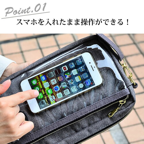 お財布、コスメポーチ、ハンカチなど必要な物がたっぷりと収納できるサイズ感ですさらに、スマートフォンを入れたまま操作できる透明ポケット付き。