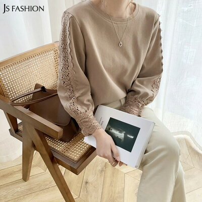 【クリアランス】レース刺繍スリーブトップス 全4色 クルーネック トレーナー スウェット 長袖 レディース 大人カジュアル シンプル 春トップス 春夏 ラフ デイリーおしゃれ F フリーサイズ 通勤 通学 大人可愛い JSファッション【210316】【3月新作】