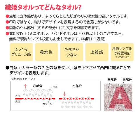 フェイスタオル・マフラータオル・スポーツタオルは100枚からご注文可能です。